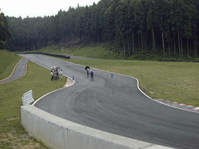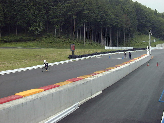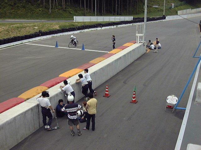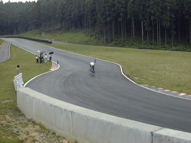 ルールは簡単。ストレートのスタート地点から逆方向、第二ヘアピン方面の上り、シケインの入り口に設けられたゴールに向かって約100mを自転車でタイムアタックするというもの。1回のみのアタック、そして自転車はイコールコンディションを期してワンメイクで争われる。ギアは3段変速。グループ4社員 新井の出したタイムを上回り、トップタイムの人に豪華賞品が贈られる。