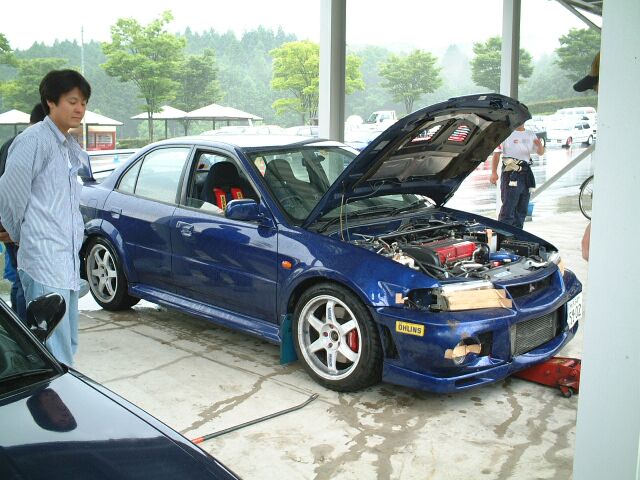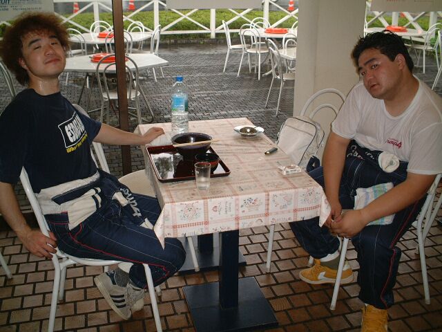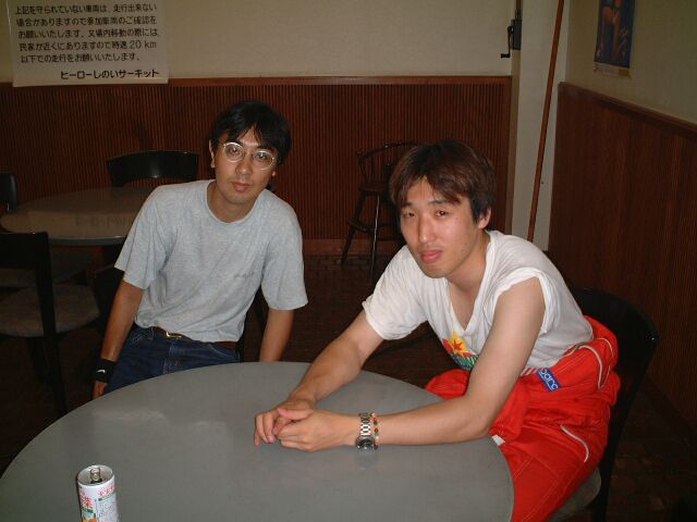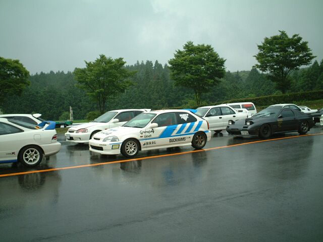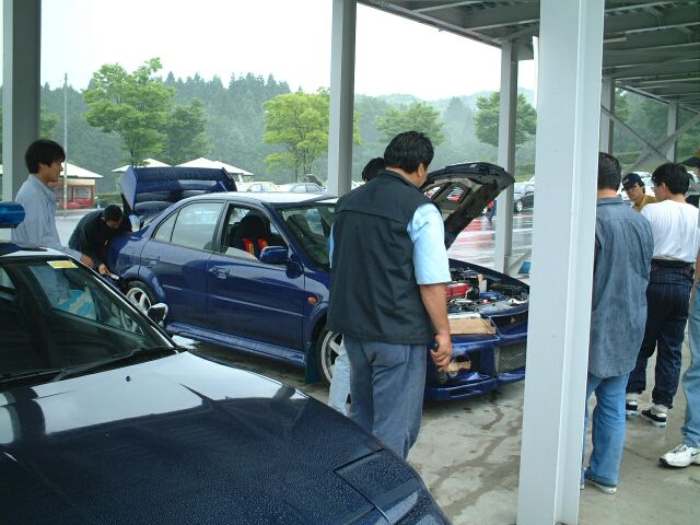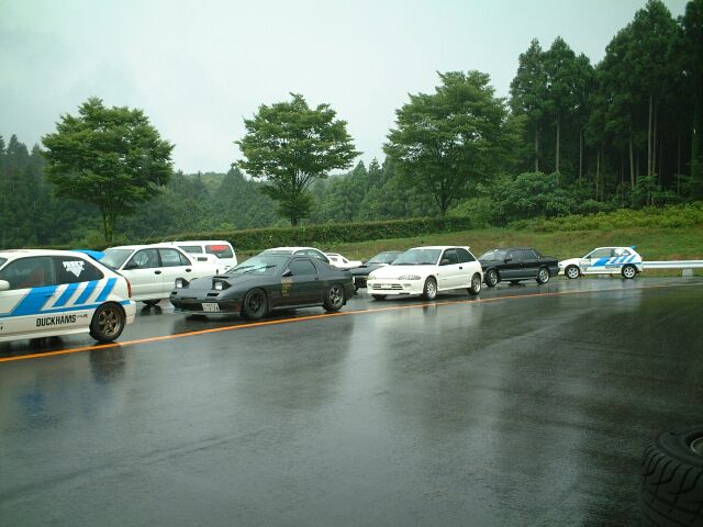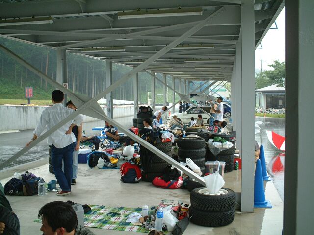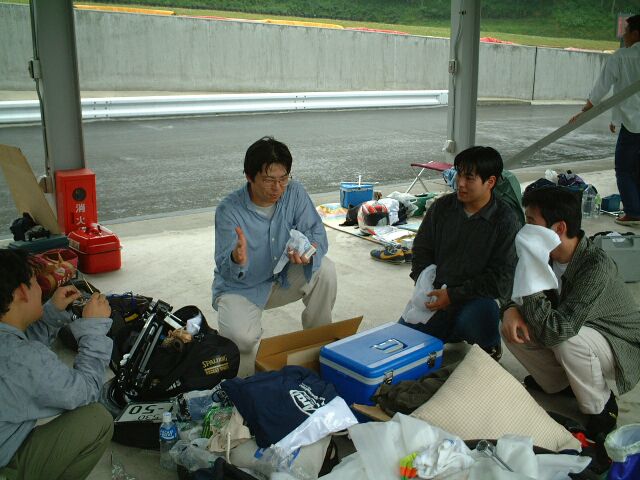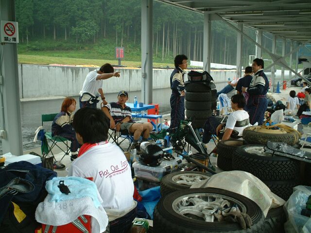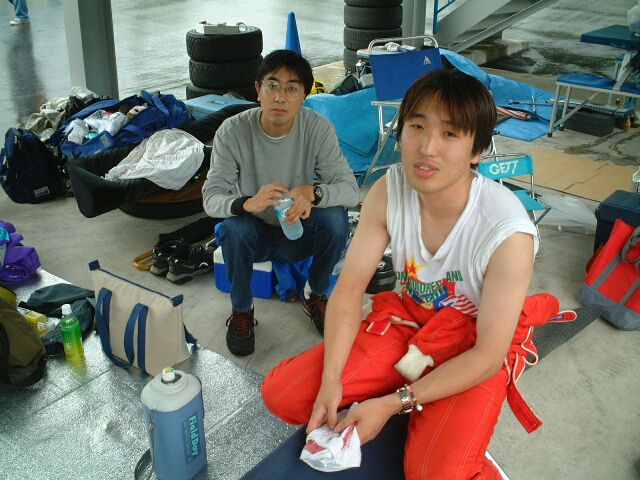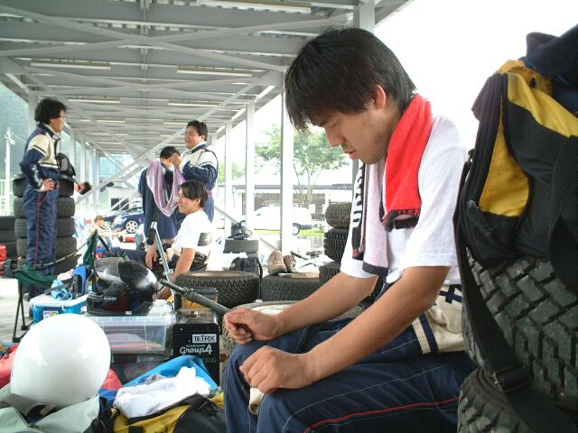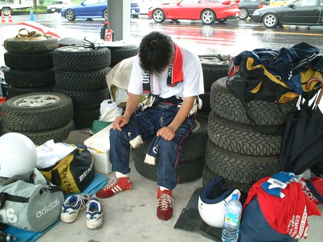 ダートタイヤ、50秒(ドライ)を叩き出したラリードライバーO氏。寝ているんじゃありません、イメージトレーニングです。かすかに動く左手でシフトチェンジをしているらしい。
