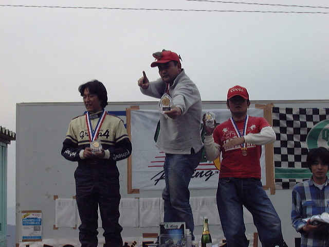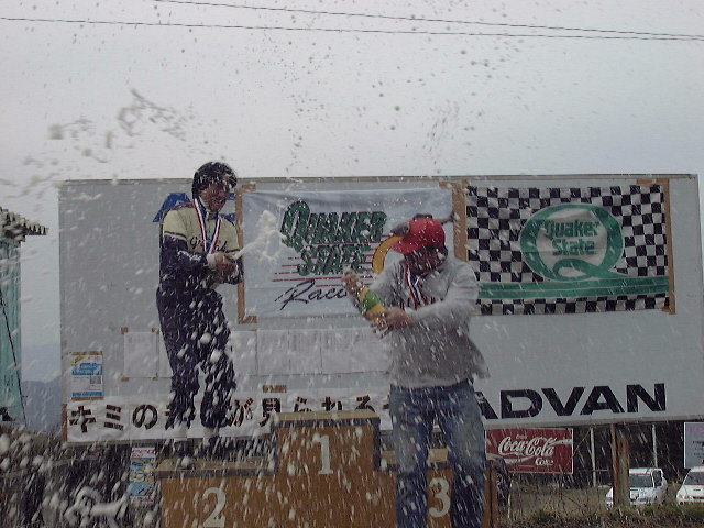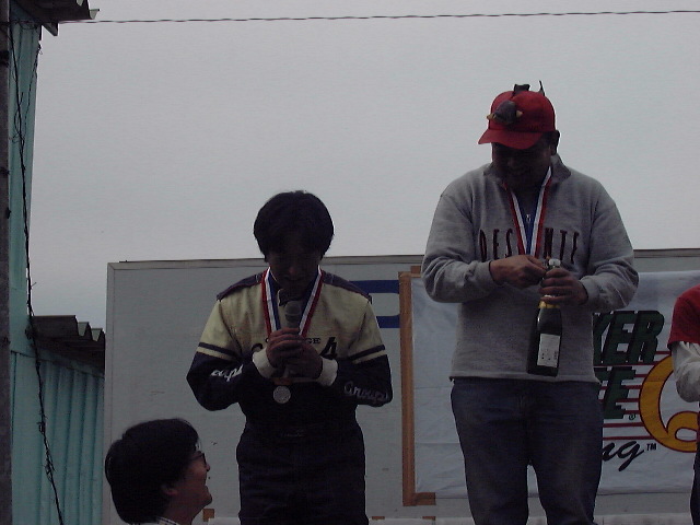 FRクラス表彰式。結果は惜しくも2位でちょっとゴキゲンナナメな前田さん。シャンパンファイトにも力が入る。