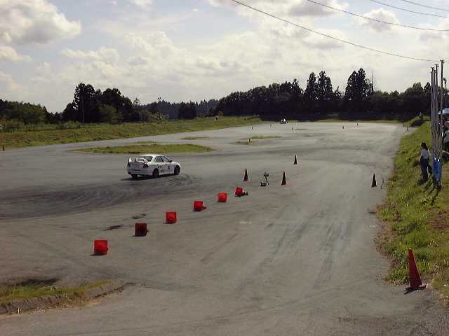 コンセントレーションを高め、スタートに臨む。そしてスタート。2速へシフトアップ。2速は一気にふけ切り、3速へシフトアップ、そしてすぐに2速へシフトダウンしターンイン。と思ったら、案の定リアが出てしまう。あー、まずいー、カウンターだーとあてたが、今度はあててる時間が長すぎてお釣りをもらう、サイアクだ。なんとか切り込み、奥のパイロンへと車を向ける。そして1速へシフトダウン・・・するはずが、1速へ入れられない。サイドはあてたものの、結局パイロンの横でほぼ停止してしまった。大失敗。しかし、気を取り直して走りきる。2本目につなげるためだ。
