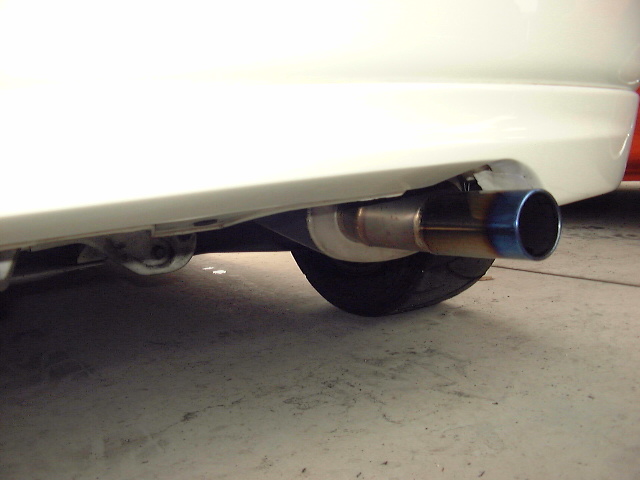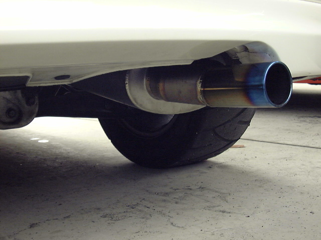 これが噂の超軽量、トルネード効果によってトルクもりもり、パワー炸裂、音はクールなオリジナルチタンマフラー(試作品)。出口がブルーに輝いているなんて、超イケてる。音もステンマフラーとは一味違う軽快な音。音量自身は以前装着していた無限エキゾーストシステムに比べて上がっているのだが、音質のせいかさほどうるさく感じないとのこと。