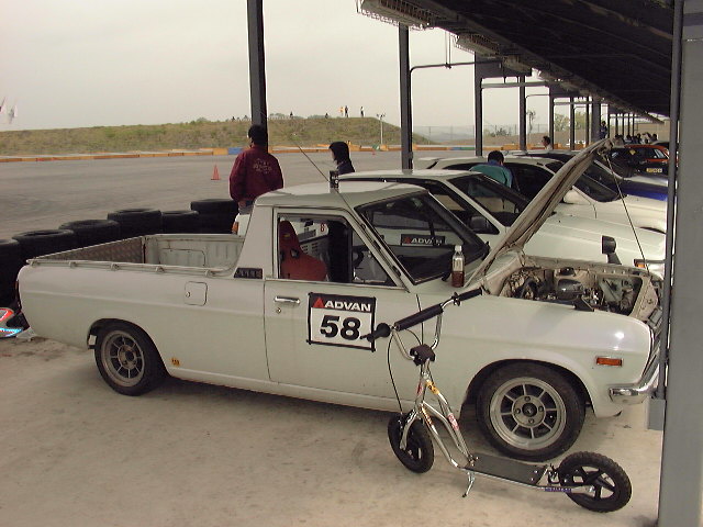 今日わざわざ来てくださった神様と相談し、一気にショックセッティングをかえる。これでスピンしたらどーにもならないが、サイドが効かない、アンダー強いでは勝負にならない。そして2ヒート目の走行を開始。すると、これが全然よい。ターンインでノーズが入り、脱出はフロントのトラクションを逃がさない。こいつはいけるぜっ! と思って最後のほうのセクションに入ると、なんか景色が違う。なんと!違うパイロンめがけて立ち上がっているのだ!!