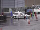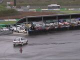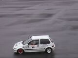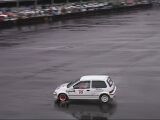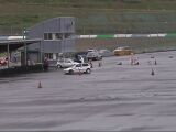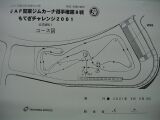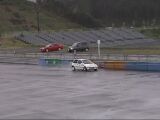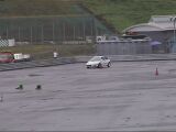 そして私がスタート。1本目の反省点は、スタート直後のサイドターン。おおっ、ターン後の車の向きは決まった!後は1本目と同じように踏むのみ。路面はウエットだか、ドライ並にいける。想定したラインを確実にトレースしていく。ううっ、なんて無駄の無い走りだ!(自分で言ってどうする)ゴール前の8の字ターン、2回目のサイドターンで車の回りがちょっと足りず、2度引きすると今度はリアが出過ぎた。ああっ、まずい!