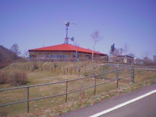 ダウンヒルバトルスタート地点、なぞの風車つきの建物は実はエネルギー館。この風車は実際に発電をしている。中にはエネルギーに関する展示があり、自転車こいで発電できる。体力の有り余っている方はどうぞ。