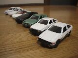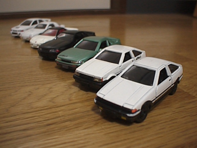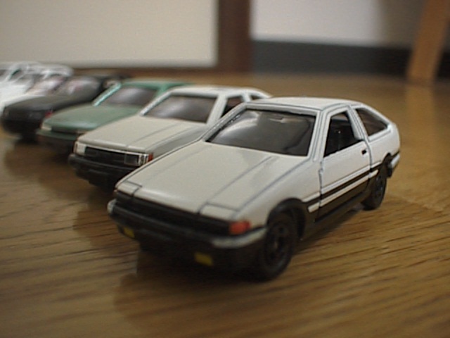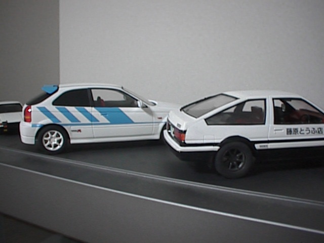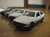 本屋をふらふらしてたら、Hobby Japanが目に付いたので久々に読んでみると、 FUJIMIからイニシャルDシリーズのプラモデルが出ていることがわかった。 即その足で買いに行き、AE86とシビックタイプRをゲット。もちろんプラモデルを 作る道具なんてひとつもないから、塗料、マスキング、筆まで一緒に買う。 やっぱり昔とった杵柄、ガンプラで鳴らした腕が唸るぜ。 ところが、考えてみればクルマのプラモデルを作るのは実に20年ぶり。 最初で最後に作ったのはギャランGTO、300円だった気がする。 すげー古いな(^^; 今のプラモデルは 1500円、イニシャルDシリーズは 1800円もする。道具とか とあわせると 8000円くらい使った。もう、子供の遊びじゃない値段だなあ。 塗料は基本的にアクリル塗料をチョイス。筆を水洗いできるし、比較的むらに なりづらいから単純に選んだんだけど、一部ラッカー塗料になってしまった。 ラッカー系は湿気に弱く、雨の日に塗ると白くくもっちゃうのだ。 さらにラッカー系は筆をシンナーで洗うので、ラリっちゃうてのもある。 結局雨が降ったので窓しめて、エアコンでドライかけながら塗装を開始。 ばっちりシンナー臭い部屋のなかで塗り塗り。塗り塗り。塗ってもすぐに 乾くわけがない。そこで他のプラモも塗り塗り。塗り塗り。 ということで、
