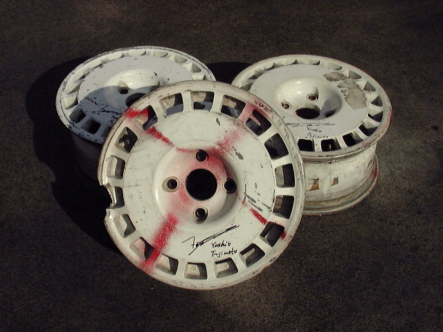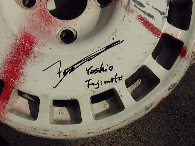 藤本選手サイン入りホイール。実際にラリーに使われた現物です。ガレージセールではこのマグネシウムホイール(サイン入り)も売っています。 限定10本なので、早いもの勝ち!