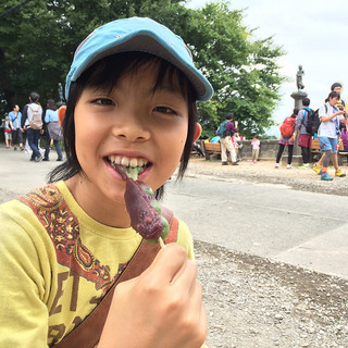 山頂につくと、たくさんの登山客で賑わっています。子供は途中でゲットした弓矢セットを背負ってご満悦。
