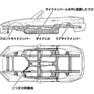 S2000のハイXボーンフレーム構造はシンプルな井桁をベースに、縦の中央フレーム2本をフロア下に落としこむ代わりに3又構造で左右サイドシルと中央のセンタートンネルに分岐、リアセクションでまた結合してリアメンバーまで伸びるという構成。