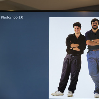 アドビ、Photoshop25周年記念 企画展示「INSIDE PHOTOSHOP」を5月22日より開催「INSIDE PHOTOSHOP」展では、Photoshop発売から現在までの25年におよぶ歴史と進化を展示で表現しています。壁面には、Photoshopが誕生して現在にいたるまでのPhotoshopの各バージョンや機能のアップデートを年表形式でまとめた「Photoshop歴史タイムライン」が展示されています。展示タイトルにもなっている「INSIDE PHOTOSHOP」は、Photoshopの巨大なユーザーインターフェイスを表しており、その壁の前に立つと、まるで自分がPhotoshopの中に入り込み、切り抜かれているような写真を撮ることができます。歴代のアイコンやツールが手に取れる形で展示されていますので、自分が初めて触れたPhotoshopのバージョンと一緒に写真を撮っていただけたらと思います。
