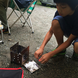 燃料用アルコールは偉大、あの火花でも着火しました。が、そこからがまた大変。なかなか薪に燃え移りません...ってことで最終的にはライター+着火剤のお世話に。文明は偉大だ。