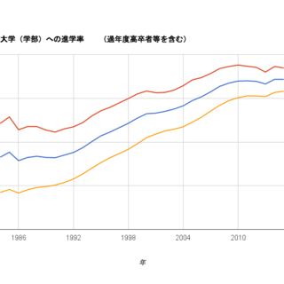 大学進学率をみてみると、バブル景気のはじまる1986年頃から1990年は合計で横ばい、その後一貫して増加基調。実は男子は45%前後から一時40%と逆に低下するのですが、女子の進学率が15%から45%へと劇的に増加するためです。このようなことから大卒の数が増加しています。