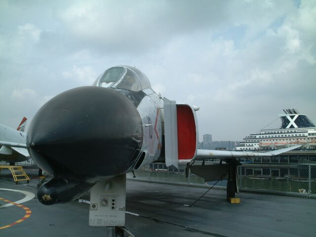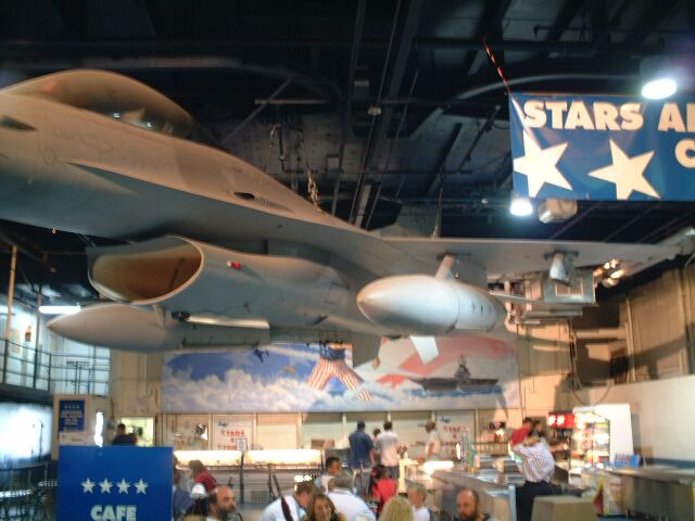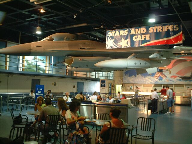 ↑なんとカフェの上にF16がちゅうぶらりーん。世界一コストの高いカフェでは??