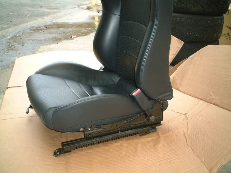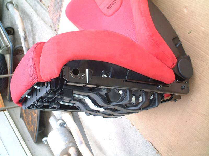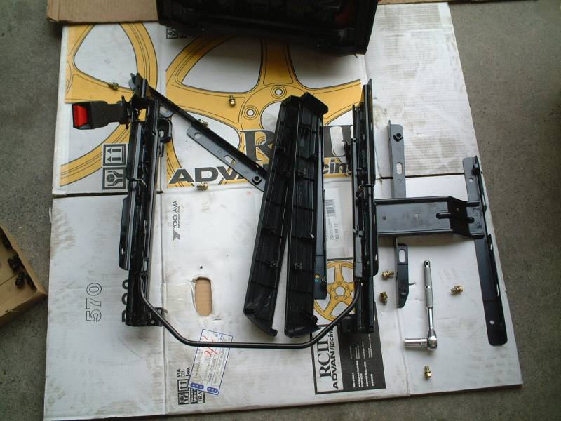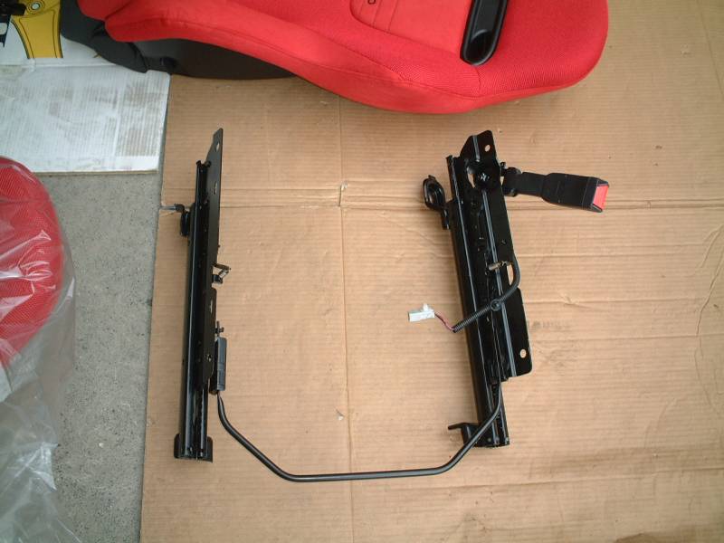 こちらはEP3のレカロシートから、シートレールを分離した状態です。助手席側です。 取り外しは私がやってないので聞いた話ですが、前後にプラスチックのプレート(写真中央)があるのでそれも外すそうです。 シートレール右側のT型の金具はハーネスを固定するためのものだったようです。 |
