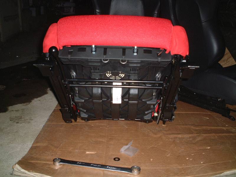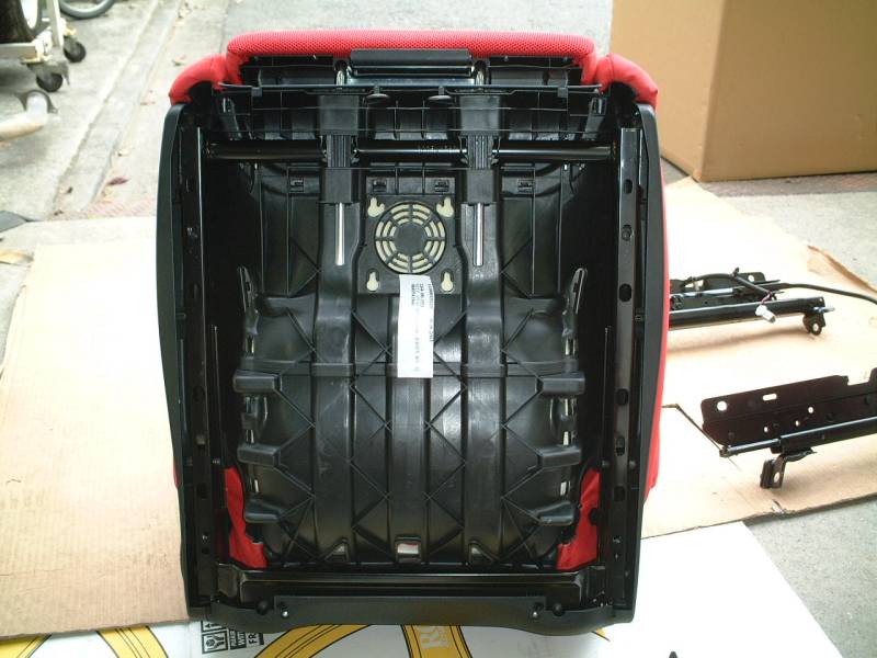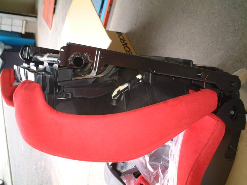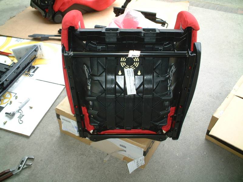 レカロシートの方ですが、シートレールを外した後に、シートからさらにサイドのプラスチックカバーを取り外します。これは内側から小さなビスで留まっていますので、シート座面の前側にあるサポート部を取り外します。 |