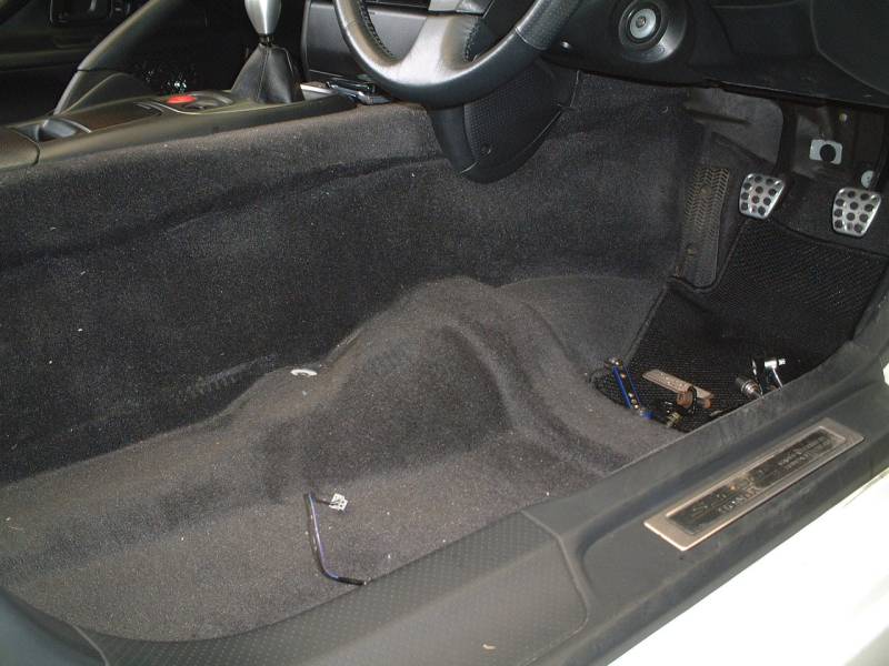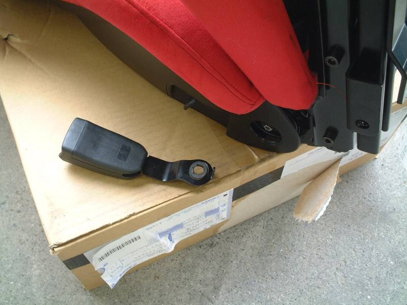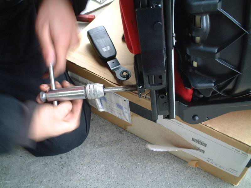 運転席のシートを外しました。ボルト4本を外し、シートベルト警告灯用のカプラを外してから外します。 シートレールのエッジで車を傷つけないように気をつけてください。 |