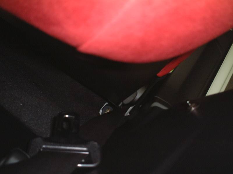 シートベルトアンカーは使いまわすので、これを外します。ボルト1本でとまっています。その後、ハーネスをシートに止めている固定ピン(プラスチック)を2箇所外します。 |