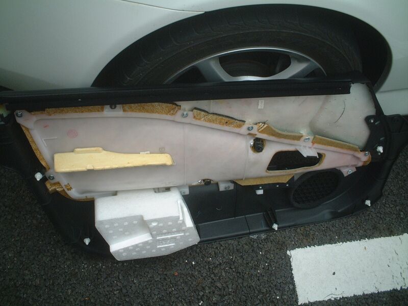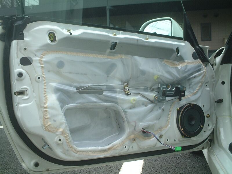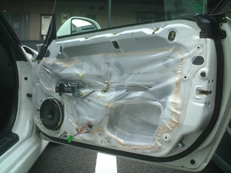 右ドアの内張りを外したところ。手順としては左側と同じだが、パワーウィンドウ用のハーネス以外にドアロック用とパワーミラーのハーネスの2つコネクタを外す必要がある。 |