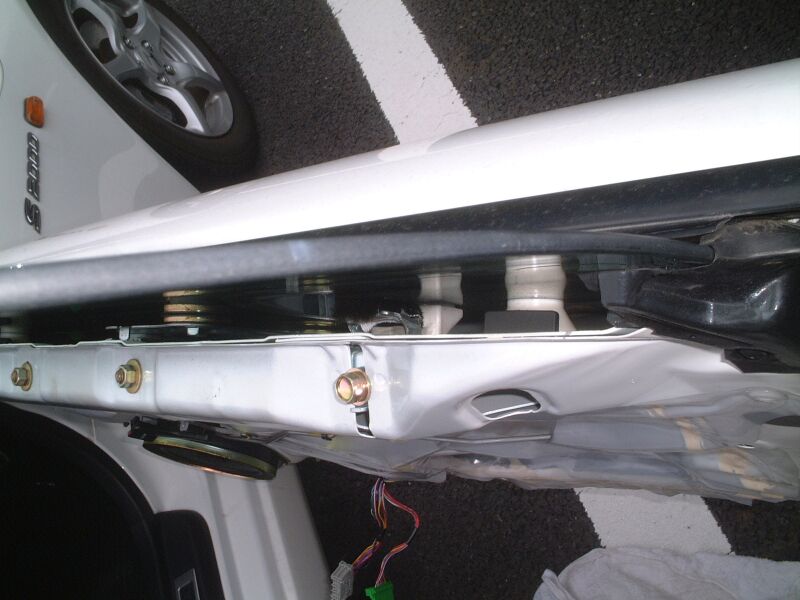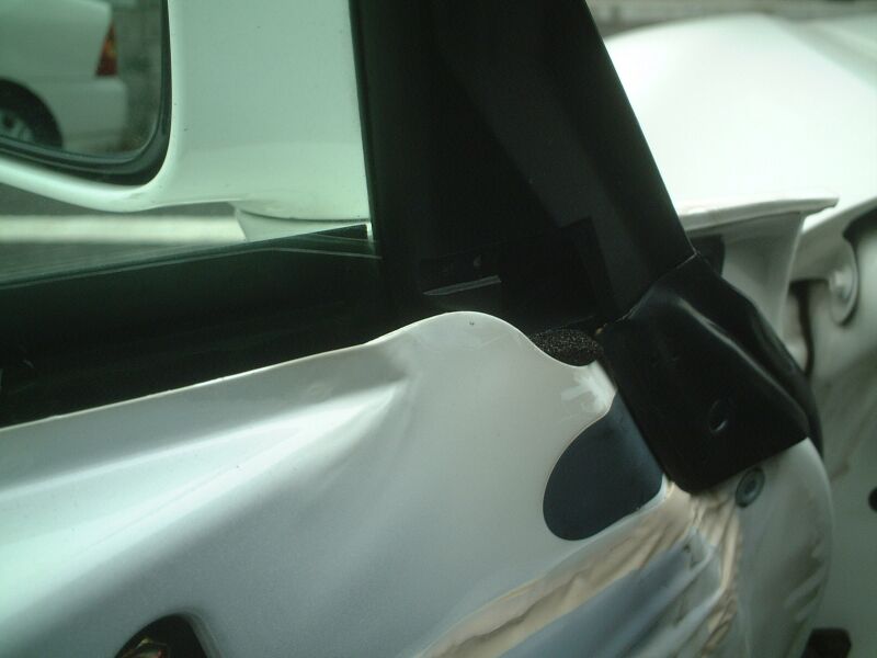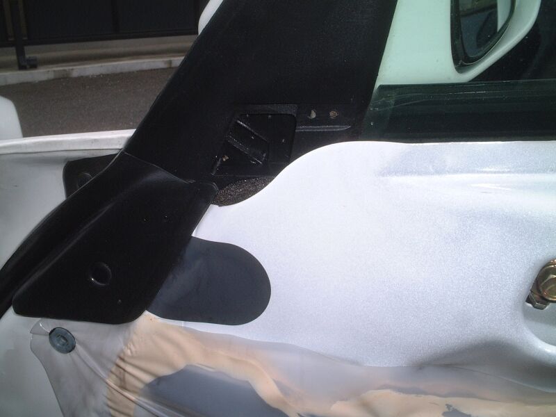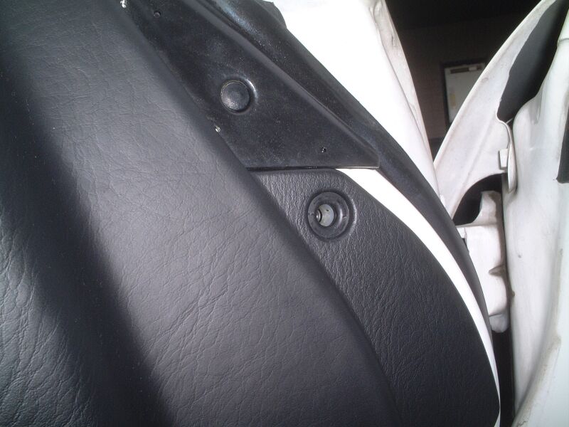 ドアの付け根に1箇所留まっている箇所がある。このプラスチックの丸いパッチを引っ張ってとる。ラジオペンチと古タオルを使って傷をつけないように。 |