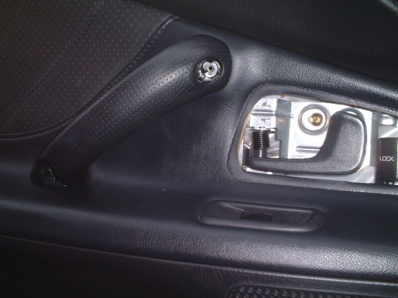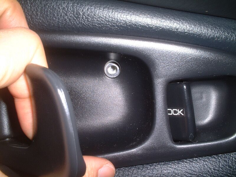 ドアの取っ手の2箇所にネジが隠れているので、マイナスドライバをつかってふさいでいるものを取る。傷がつかないように注意。