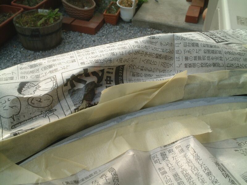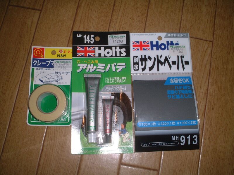 アルミパテを説明書どおりに混ぜ合わせて、傷に塗りこむ。その後ラップで表面をならしながらマスクした。 |