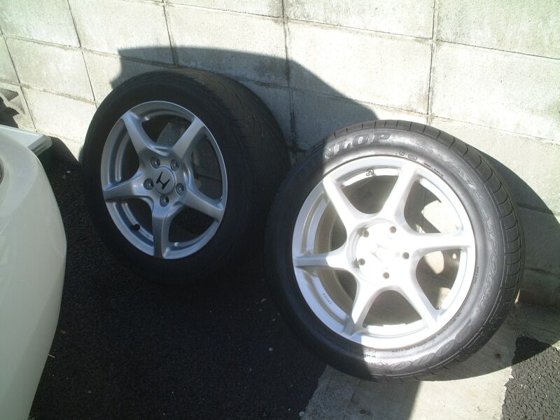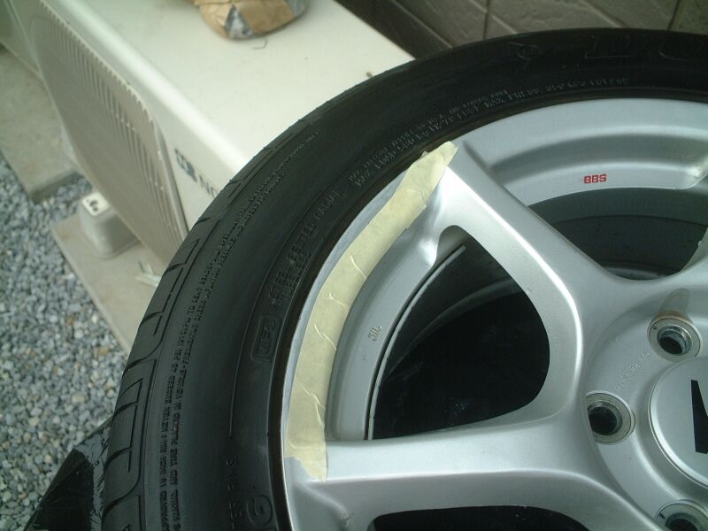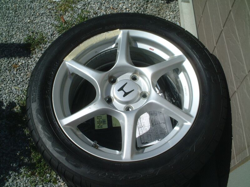 フロントが純正、リアにBBSホイールをはいたところ。 フロントホイールが補修中のためのアンバランスな状態。 |