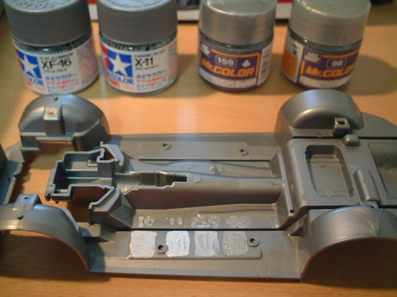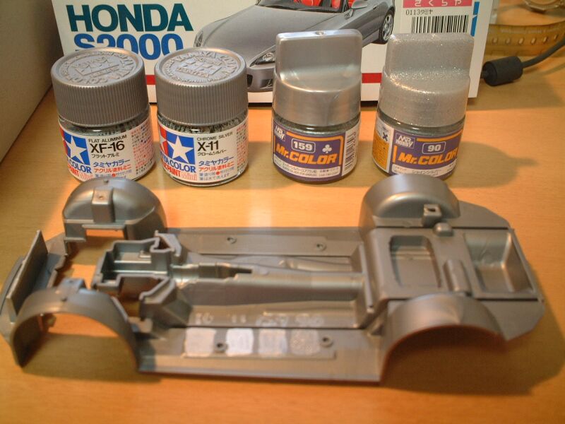 さて、今回は前回の反省を生かしてシルバー系塗料を4種類買ってきた。 ちなみにこのプラモデルはS2000のシャーシー部分。 |
